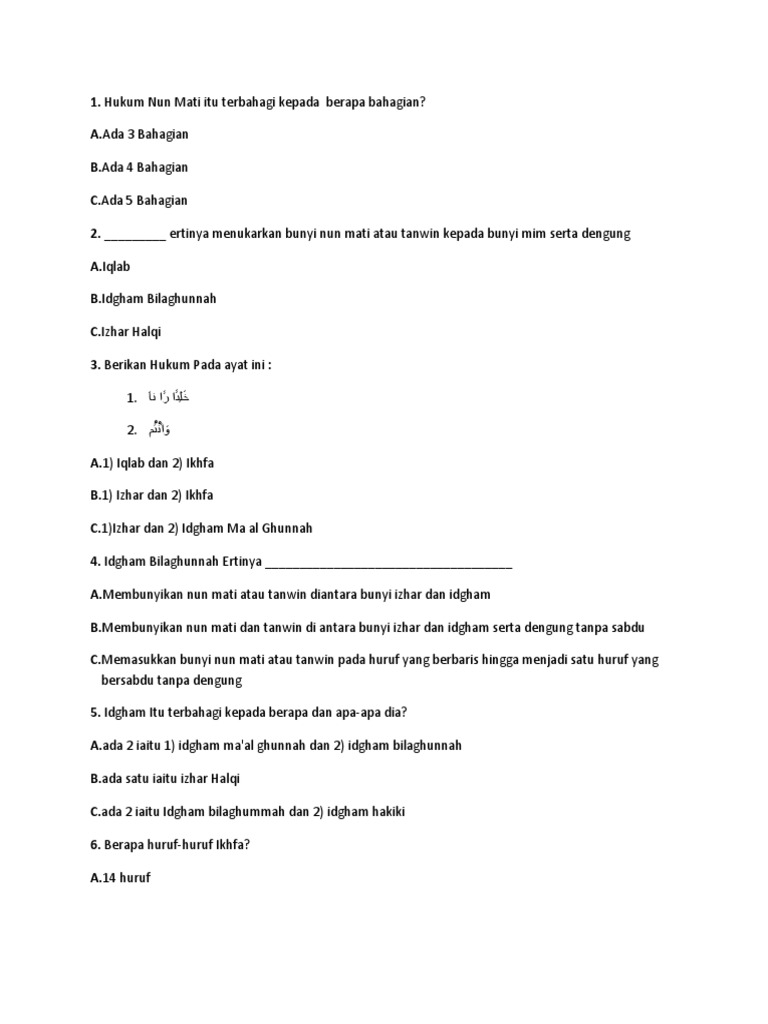 A 1 b 3 c 2 d 0 3 iqlab perlu baca dengan denggung atau tidak. Idgham tidak akan terhasil kecuali dari dua kalimah. Ada 2 iaitu Idgham Bilaghunnah dan Idgham Hakiki.
