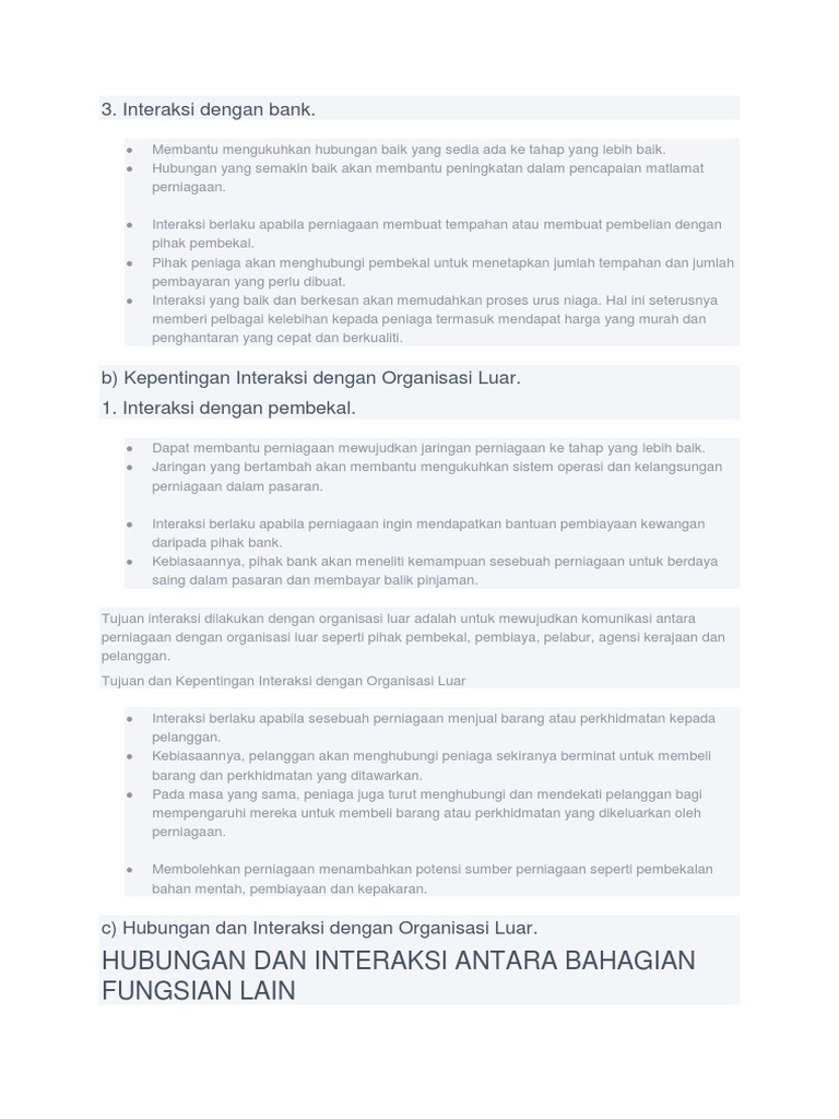A Pembelian pengurus kenal pasti pilih dan nilai pembekal barangan adakan rundingan bincang syarat pembelian dll. Organisasi Luar yang saling berinteraksi dalam sesebuah perniagaan ialah. 45 HUBUNGAN DAN INTERAKSI ANTARA BAHAGIAN FUNGSIAN LAIN Nyatakan kepentingan interaksi dengan organisasi luar.