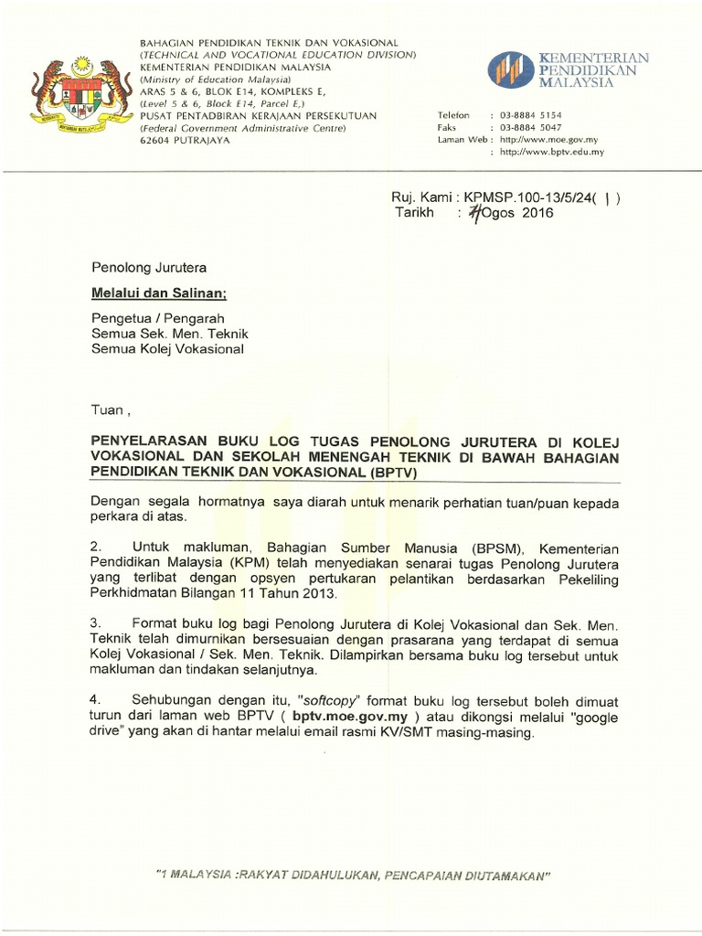 Peranan utamanya adalah menentukan pelaksanaan dan kemajuan pendidikan teknikal dan vokasional secara berterusan di negara ini. BAHAGIAN TEKNIK DAN VOKASIONAL KEMENTERIAN PENDIDIKAN MALAYSIA ARAS 5 6 BLOK E14 KOMPLEKS. Kami warga Bahagian Pendidikan dan Latihan Teknikal Vokasional dengan penuh tekad dan iltizam akan menumpukan seluruh tenaga dan usaha kami kearah merealisasikan sistem pendidikan teknikal dan vokasional yang cekap dan berkesan.