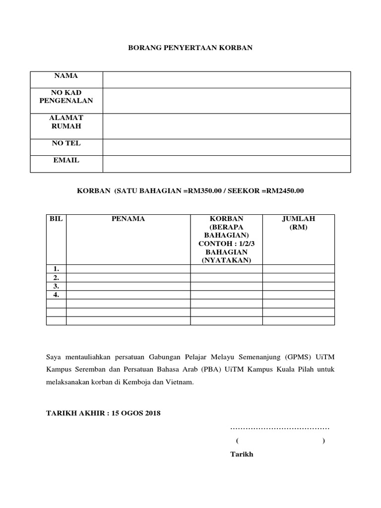 Anda boleh lakukan pembayaran ibadah korban dengan mudah dan selamat di website dengan langkah berikut. Sedekah korban ialah perbuatan seseorang menyumbangkan sejumlah wang bagi menampung sebahagian daripada harga bahagian korban. Bukti Bayaran gambar slip Saya nama dengan ini bersetuju untuk melaksanakan ibadah korbanaqiqah sebanyak berapa bahagian lembuekor kambing dan saya bersetuju untuk wakilkan kepada pihak.